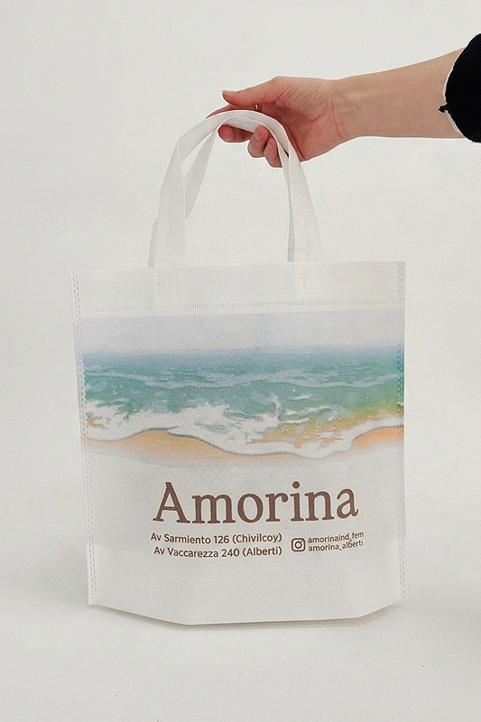 Impresión hasta tres colores en bolsas de friselina blancas o beige, en una sola cara o en ambas caras según las cantidades a confeccionar (desde 100 unidades).